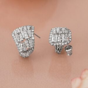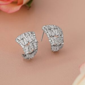 Earrings : These rhodium-plated half hoop earrings are studded with baguette and round cubic zirconia stones, offering a sculpted festive look perfect for special celebrations. Elegant Gifting Option: A thoughtful gift for birthdays, anniversaries, Raksha Bandhan, or festive occasions—these studs blend modern charm with timeless grace. Material : & Care Dimension : Length : 3 cm ; Width : 1 cm Net Weight : 10 Gram Material : Brass Net Quantity : 1 Pair of Earrings Care Label : It is advisable to avoid contact with water and organic chemicals i.e. perfume sprays. Store jewellery in airtight box. After use, wipe the jewellery with soft cotton cloth.