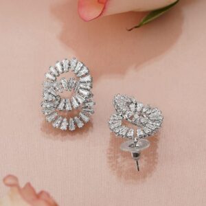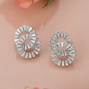 Earrings : Crafted in a radiant interlinked oval silhouette, these rhodium-plated statement stud earrings dazzle with high-grade cubic zirconia stones—ideal for festive and party wear looks. Festive & Party Perfect: These statement earrings are perfect for festive celebrations, receptions, or any high-glam event. Their bold design and full ear coverage make them an elegant choice for upscale occasions. Material : & Care Dimension : Length : 4 cm ; Width : 1 cm Net Weight : 20 Gram Material : Brass Net Quantity : 1 Pair of Earrings Care Label : It is advisable to avoid contact with water and organic chemicals i.e. perfume sprays. Store jewellery in airtight box. After use, wipe the jewellery with soft cotton cloth.