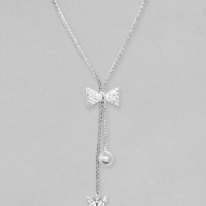 Rhodium Plated, Minimal Chain Bow Motif Zircons Studded Drop Necklace. – Silver