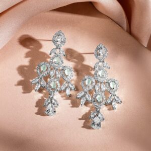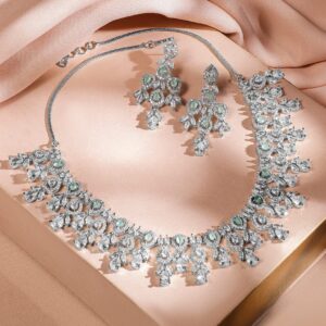 Jewellery Set : A rhodium-plated premium necklace set adorned with mint green and white cubic zirconia stones. Designed for women, perfect for weddings, festive occasions, and special events. Occasion : Bring your style to a whole new level with this handcrafted piece of jewellery. When you’re celebrating a special Occasion : – a birthday, wedding, festive or personal milestone – this piece adds that extra something that makes us feel special and looking our best. Material & Care Dimension : Length : Necklace : 21 cm, Earrings : 5 cm Dimension : Width : Necklace : 2.5 cm, Earrings : 2 cm Net Weight : 60.77 Gram Net Quantity : 1 Necklace & 1 Pair of Earrings Material :Brass Care Label : It is advisable to avoid contact with water and organic chemicals i.e. perfume sprays. Store jewellery in airtight box. After use, wipe the jewellery with soft cotton cloth.