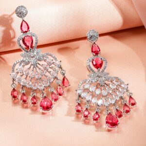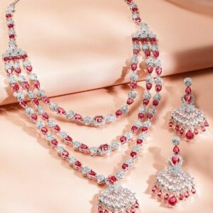 Necklace Set : rhodium-plated brass chandelier necklace set with multi-layer ruby red stones and cubic zirconia, perfect for weddings, festive events, and grand celebrations. Occasion Ready: Perfect choice for weddings, receptions, festivals, parties, or special occasions to add a touch of regal elegance Material : & Care Dimension : Length : 22 cm / 2.5 cm, Width: 4.5 cm / 2.5 cm Material : Brass Net Weight : 28.85 Gram Net Quantity: 1 Necklace & 1 Pair of Earrings Care Label: It is advisable to avoid contact with water and organic chemicals i.e. perfume sprays. Store jewellery in airtight box. After use, wipe the jewellery with soft cotton cloth.