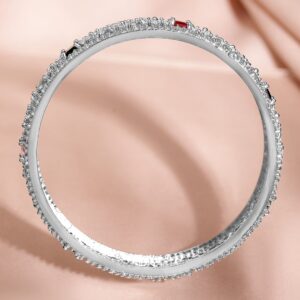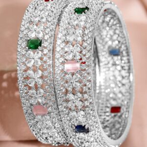 Bangle :Add vibrance to your jewelry collection with these rhodium-plated bangles featuring multicolor cubic zirconia stones, offering a chic and premium aesthetic. Occasion : Bring your style to a whole new level with this handcrafted piece of jewellery. When you’re celebrating a special Occasion : – a birthday, wedding, or personal milestone – this piece adds that extra something that makes us feel special and looking our best. Material : & Care Dimension : Net Weight: 47.62g Net Quantity: 2 Bangles Material :Brass Care Label : It is advisable to avoid contact with water and organic chemicals i.e. perfume sprays. Store jewellery in airtight box. After use, wipe the jewellery with soft cotton cloth.