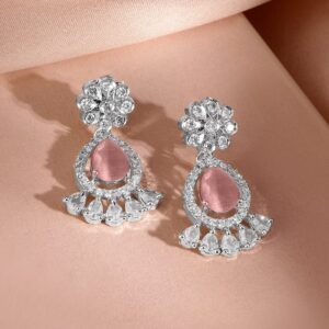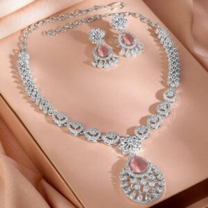 Jewellery Set : This rhodium-plated necklace set features elegant pastel pink AD stones and dazzling cubic zirconia, paired with matching earrings for a luxurious and graceful statement look. Occasion : Bring your style to a whole new level with this handcrafted piece of jewellery. When you’re celebrating a special Occasion : – a birthday, wedding, or personal milestone – this piece adds that extra something that makes us feel special and looking our best. Material : & Care Dimension : Length : NS- 21 ; E- 3.2 cm, Width: NS- 2.5 ; E- 1.2 W Net Quantity : 1 Necklace & 2 Earrings Net Weight: 36.20 g Material :Brass Care Label : It is advisable to avoid contact with water and organic chemicals i.e. perfume sprays. Store jewellery in airtight box. After use, wipe the jewellery with soft cotton cloth.