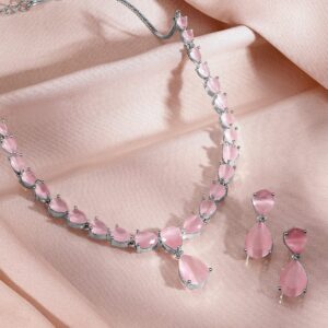 Jewellery Set : This rhodium-plated necklace set features delicate pastel pink AD stones and cubic zirconia, paired with matching earrings for a graceful and luxurious statement look. Occasion : Bring your style to a whole new level with this handcrafted piece of jewellery. When you’re celebrating a special Occasion : – a birthday, wedding, or personal milestone – this piece adds that extra something that makes us feel special and looking our best. Material : & Care Dimension : Length : 30 cm / 2.3 cm, Width: 5 cm / 2.3 cm Net Quantity : 1 Necklace & 2 Earrings Net Weight: 25.5 g Material :Brass Care Label : It is advisable to avoid contact with water and organic chemicals i.e. perfume sprays. Store jewellery in airtight box. After use, wipe the jewellery with soft cotton cloth.