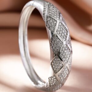 Bracelet :’ Rhodium-Plated Openable Bracelet features an exquisite pave diamond-inspired pattern with shimmering cubic zirconia, offering timeless elegance and versatility for any look. Occasion : Bring your style to a whole new level with this handcrafted piece of jewellery. When you’re celebrating a special Occasion : – a birthday, wedding, or personal milestone – this piece adds that extra something that makes us feel special and looking our best. Material : & Care Dimension : Length : 6.5 cm, Width: 1.5 cm Net Weight: 44.77g Net Quantity : 1 Bracelet Material :Brass Care Label : It is advisable to avoid contact with water and organic chemicals i.e. perfume sprays. Store jewellery in airtight box. After use, wipe the jewellery with soft cotton cloth.
