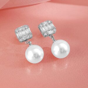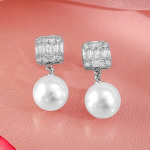 Earrings : Refined rhodium-plated drop earrings with delicate pearls and cubic zirconia, adding a timeless touch to your ensemble. Occasion : Bring your style to a whole new level with this handcrafted piece of jewellery. When you’re celebrating a special Occasion : – a birthday, wedding, or personal milestone – this piece adds that extra something that makes us feel special and looking our best. Material : & Care Dimension : Length : 3.5 cm, Width: 1 cm Net Weight: 10.45 g Net Quantity : 1 Pair Of Earrings Material :Brass Care Label : It is advisable to avoid contact with water and organic chemicals i.e. perfume sprays. Store jewellery in airtight box. After use, wipe the jewellery with soft cotton cloth.