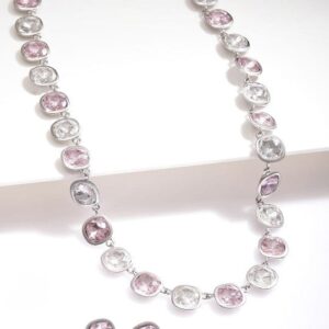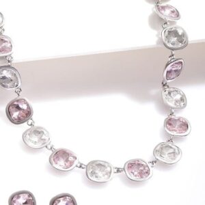 Jewellery Set : This elegant necklace set is rhodium plated and features sparkling pink and white cubic zirconia stones in a classic bezel setting. The statement necklace is accompanied by matching earrings, adding a sophisticated touch to any outfit. The shimmering gemstones and the versatile design make this set a stunning choice for both formal and casual looks. Occasion : Bring your style to a whole new level with this handcrafted piece of jewellery. When you’re celebrating a special Occasion : – a birthday, wedding, or personal milestone – this piece adds that extra something that makes us feel special and looking our best. Material : & Care Dimension : Size : Necklace : 21.5 cm, Earrings : 1.2 cm Net Weight: 70g Net Quantity : 1 necklace & 2 Earrings Material : Care Label : It is advisable to avoid contact with water and organic chemicals i.e. perfume sprays. Store jewellery in airtight box. After use, wipe the jewellery with soft cotton cloth.