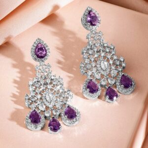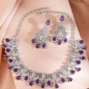 Jewelry Set : This rhodium-plated necklace set features dazzling purple sapphire and cubic zirconia stones, paired with matching earrings. A statement piece for elegant and glamorous looks. Occasion : Bring your style to a whole new level with this handcrafted piece of jewelry. When you’re celebrating a special Occasion : – a birthday, wedding, festive or personal milestone – this piece adds that extra something that makes us feel special and looking our best. Material : & Care Dimension : Necklace Size : 12 cm / 7.5 cm, Earrings Size : 4.3 cm / 2.6 cm Material: Brass Net Weight: 62.96 Gram Net Quantity: 1 Necklace & 1 Pair of Earrings Care Label: It is advisable to avoid contact with water and organic chemicals i.e. perfume sprays. Store jewelry in airtight box. After use, wipe the jewelry with soft cotton cloth.
