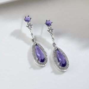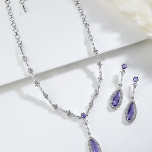 Jewellery Set : presents an elegant rhodium-plated necklace set featuring striking purple sapphire teardrop stones surrounded by clear AD and cubic zirconia. The necklace is complemented by a delicate chain adorned with round and baguette-cut stones, leading to the eye-catching purple teardrop pendant. Matching earrings complete this stunning set, perfect for adding a touch of sophistication to any look. Occasion : Bring your style to a whole new level with this handcrafted piece of jewellery. When you’re celebrating a special Occasion : – a birthday, wedding, or personal milestone – this piece adds that extra something that makes us feel special and looking our best. Material : & Care Dimension : Size : Necklace : 24.3 cm, Earrings : 4.9 cm Material: Brass Net Weight: 26.1 Gram Net Quantity: 1 Necklace & 1 Pair of Earrings Care Label: It is advisable to avoid contact with water and organic chemicals i.e. perfume sprays. Store jewellery in airtight box. After use, wipe the jewellery with soft cotton cloth.