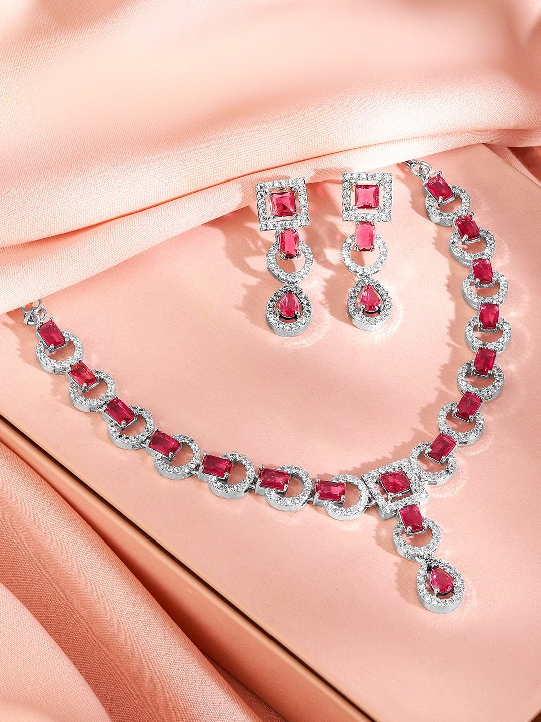Rhodium-Plated Ruby Pink AD & Cubic Zirconia Studded Necklace Set – Ruby Pink