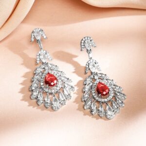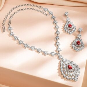 Indulge in elegance with this rhodium-plated luxe necklace set, featuring ruby red & white cubic zirconia in a cascading drop design, perfect for weddings & grand celebrations. Occasion : Bring your style to a whole new level with this handcrafted piece of jewellery. When you’re celebrating a special Occasion : – a birthday, wedding, festive or personal milestone – this piece adds that extra something that makes us feel special and looking our best. Material : & Care Dimension : Length : Neckace : 19 cm, Earrings : 3 cm Net Weight: 70 g Net Quantity : 1 Necklace & 1 Pair of Earrings Material : Brass Care Label : It is advisable to avoid contact with water and organic chemicals i.e. perfume sprays. Store jewellery in airtight box. After use, wipe the jewellery with soft cotton cloth.