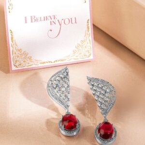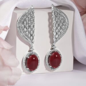 Drop Earrings : rhodium-plated drop earrings featuring oval ruby red stones and white cubic zirconia, crafted in a layered wing-style design. Ideal for women to elevate party and special occasion looks. Occasion : Bring your style to a whole new level with this handcrafted piece of jewellery. When you’re celebrating a special Occasion : – a birthday, wedding, festives or personal milestone – this piece adds that extra something that makes us feel special and looking our best. Material & Care Dimension : Length : 7 cm ; Width : 2.5 cm Net Weight : 32 gram Plating : Rhodium Plated Material : Brass Collection : AD and Cubic Zirconia Net Quantity : 1 Pair of Earrings Care Label : It is advisable to avoid contact with water and organic chemicals i.e. perfume sprays. Store jewellery in airtight box. After use, wipe the jewellery with soft cotton cloth.