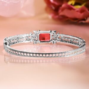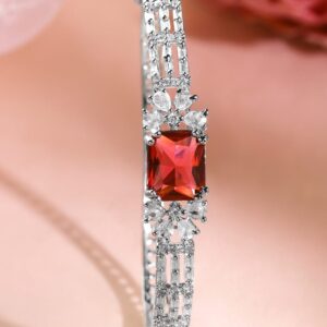 This rhodium-plated bracelet features a striking ruby red rectangular stone at the center, enhanced with white cubic zirconia in a double-line design. A luxurious choice for elegant dressing. Occasion : Bring your style to a whole new level with this handcrafted piece of jewellery. When you’re celebrating a special Occasion : – a birthday, wedding, festive, party or personal milestone – this piece adds that extra something that makes us feel special and looking our best. Material : & Care Dimension : Length: 2.6 cm ; Width: 1cm Material: Brass Net Weight: 12.93 Gram Net Quantity: 1 Bracelet Care Label: It is advisable to avoid contact with water and organic chemicals i.e. perfume sprays. Store jewellery in airtight box. After use, wipe the jewellery with soft cotton cloth.