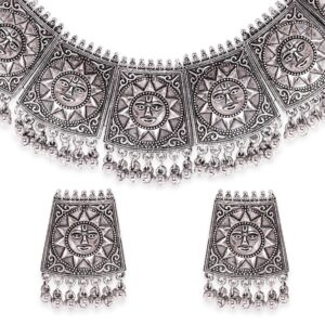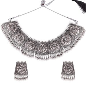 Elevate your style with this exquisite handcrafted statement necklace set. Crafted with silver oxidized accents and adorned with lustrous pearl beads, this set exudes elegance and charm. Make a lasting impression with this timeless accessory. Material & Care Dimension : Necklace : 18 cm Earrings : 3 cm Material : Alloy Care Label : It is advisable to avoid contact with water and organic chemicals i.e. perfume sprays. Store jewellery in airtight box. After use, wipe the jewellery with soft