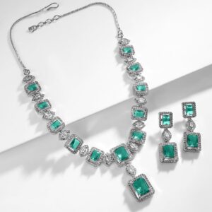 Jewellery Set : Discover the elegance of Rhodium Plated Sapphire & Cubic Zicronia Studded Premium Jewellery Set. This piece combines quality craftsmanship with a timeless design, making it perfect for any occasion. Elevate your style effortlessly and enjoy compliments on your refined taste. A must-have addition to your jewelry collection. Occasion : Bring your style to a whole new level with this handcrafted piece of jewellery. When you’re celebrating a special Occasion : – a birthday, wedding, or personal milestone – this piece adds that extra something that makes us feel special and looking our best. Material : & Care Dimension : Necklace Size : 14/4, Earrings Size : 1.5/1.5 Material :Alloy Care Label : It is advisable to avoid contact with water and organic chemicals i.e. perfume sprays. Store jewellery in airtight box. After use, wipe the jewellery with soft cotton cloth.