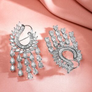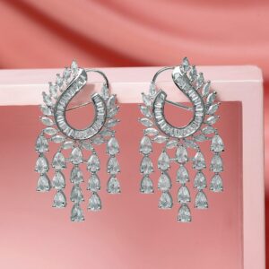 Earrings : These dazzling rhodium-plated chandelier earrings in a silver tone feature an intricate cascading design, adorned with multiple pear-shaped cubic zirconia stones. A bold and elegant statement piece, perfect for adding glamour to any outfit. Occasion : Bring your style to a whole new level with this handcrafted piece of jewellery. When you’re celebrating a special Occasion : – a birthday, wedding, or personal milestone – this piece adds that extra something that makes us feel special and looking our best. Material : & Care Dimension : Size : Neckace : 13.5 cm, Earrings : 9 cm Net Quantity : Set of 2 Earrings Net Weight: 21.96 g Material :Brass Care Label : It is advisable to avoid contact with water and organic chemicals i.e. perfume sprays. Store jewellery in airtight box. After use, wipe the jewellery with soft cotton cloth.