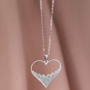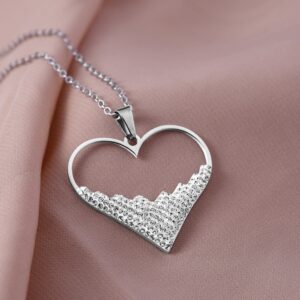 About:- This exquisite heart-shaped pendant necklace features a modern design with a Rhodium plating over stainless steel, ensuring it remains tarnish-free and waterproof. Adorned with sparkling zirconia stones, this necklace adds a touch of elegance to any outfit. Its demi-fine quality makes it a versatile accessory for any jewelry collection, suitable for both casual and formal occasions. Occasion : Bring your style to a whole new level with this handcrafted piece of jewellery. When you’re celebrating a special Occasion : – a birthday, wedding, or personal milestone – this piece adds that extra something that makes us feel special and looking our best. Material : & Care Dimension :40 cm Material : Stainless Steel Weight : 3.87g Net Qnty : 1 Necklace Care Label : It is advisable to avoid contact with water and organic chemicals i.e. perfume sprays. Store jewellery in airtight box. After use, wipe the jewellery with soft cotton cloth