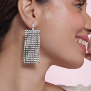 Earrings : Elevate your style with these stunning rhodium-plated statement earrings. Featuring a dazzling multi-strand design adorned with sparkling cubic zirconia, these dangle earrings are perfect for making a glamorous impact. Ideal for evening events or adding a touch of elegance to your daily attire, these earrings are a must-have for any jewelry lover. Occasion : Bring your style to a whole new level with this handcrafted piece of jewellery. When you’re celebrating a special Occasion : – a birthday, wedding, or personal milestone – this piece adds that extra something that makes us feel special and looking our best. Material : & Care Dimension : Size : Length : 7 cm, Width : 3 cm Material :Brass Care Label : It is advisable to avoid contact with water and organic chemicals i.e. perfume sprays. Store jewellery in airtight box. After use, wipe the jewellery with soft cotton cloth.