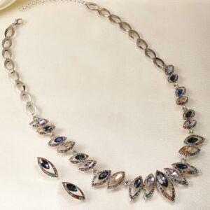 Jewellery Set : This stunning statement necklace set is rhodium-plated, featuring a mix of blue, white, and multicolor cubic zirconia gemstones in elegant marquise shapes. The intricate design offers a luxurious feel, paired with matching earrings for a complete and glamorous look. Occasion : Bring your style to a whole new level with this handcrafted piece of jewellery. When you’re celebrating a special Occasion : – a birthday, wedding, or personal milestone – this piece adds that extra something that makes us feel special and looking our best. Material : & Care Dimension : Size : Necklace : 25 cm, Earrings : 2.3 cm Net Weight: 80g Net Quantity : 1 necklace & 2 Earrings Material : Care Label : It is advisable to avoid contact with water and organic chemicals i.e. perfume sprays. Store jewellery in airtight box. After use, wipe the jewellery with soft cotton cloth.