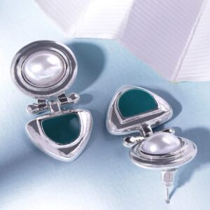 rhodium-plated statement stud earrings feature a bold design with green stone and pearl accents. A unique combination of elegance and modern style, perfect to elevate any outfit. Material & Care Dimension : Length : 2.5 cm ; Width : 1.3 cm Material : Brass Care Label : It is advisable to avoid contact with water and organic chemicals i.e. perfume sprays. Store jewellery in airtight box. After use, wipe the jewellery with soft cotton cloth.