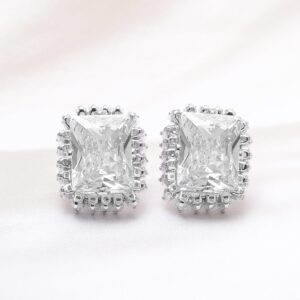 Earrings : These stunning rhodium-plated stud earrings feature large princess-cut cubic zirconia stones, surrounded by a halo of sparkling accents. The radiant stones are expertly set to capture and reflect light, creating a dazzling effect that’s perfect for adding a touch of elegance to any outfit. With their bold design and high-quality craftsmanship, these statement earrings are a must-have for those who love sophisticated, timeless jewelry. Ideal for both everyday wear and special occasions, these earrings promise to be a standout addition to your collection. Occasion : Bring your style to a whole new level with this handcrafted piece of jewellery. When you’re celebrating a special Occasion : – a birthday, wedding, or personal milestone – this piece adds that extra something that makes us feel special and looking our best. Material : & Care Dimension : Size : Length : 1.5 cm, Width : 1.2 cm Material :Brass Care Label : It is advisable to avoid contact with water and organic chemicals i.e. perfume sprays. Store jewellery in airtight box. After use, wipe the jewellery with soft cotton cloth.