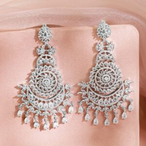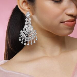 These rhodium-plated chandelier earrings feature intricate filigree work and are fully embellished with white AAA cubic zirconia stones, offering radiant sparkle for luxe occasion styling. Occasion : Bring your style to a whole new level with this handcrafted piece of jewellery. When you’re celebrating a special Occasion : – a birthday, wedding, festive, party or personal milestone – this piece adds that extra something that makes us feel special and looking our best. Material & Care Dimension: Length: 11 cm ; Width: 4.5 Net Weight: 44.23 Gram Material : Brass Net Quantity: 1 Pair of Earrings Care Label : It is advisable to avoid contact with water and organic chemicals i.e. perfume sprays. Store jewellery in airtight box. After use, wipe the jewellery with soft cotton cloth.