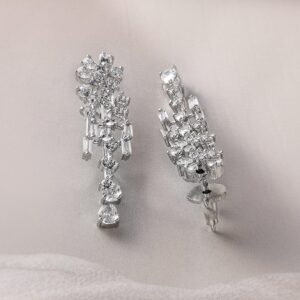 This rhodium-plated premium jewelry set features a stunning necklace and matching earrings. Adorned with white AD and cubic zirconia stones, it adds elegance and sparkle to any occasion. Material: Wipe with a clean, dry cloth to remove dust Size : Necklace : 21 cm, Earrings : 4 cm