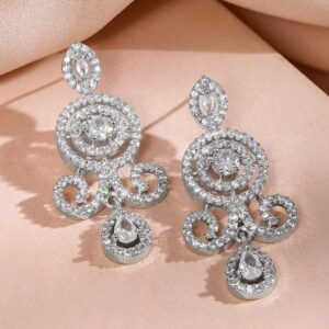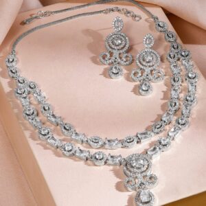 Necklace Set : This luxe necklace set features a rhodium-plated finish with two elegant layers of white baguette-cut cubic zirconia stones, paired with matching chandelier earrings, perfect for glamorous evening looks. Occasion : Bring your style to a whole new level with this handcrafted piece of jewellery. When you’re celebrating a special Occasion : – a birthday, wedding, parties or personal milestone – this piece adds that extra something that makes us feel special and looking our best. Material : & Care Dimension : Size : Necklace : 17 cm, Earrings : 1.7 cm Net Quantity : 1 Necklace & 1pair of Earrings Net Weight: 46.98 g Material :Brass Plating : Rhodium Plated Care Label : It is advisable to avoid contact with water and organic chemicals i.e. perfume sprays. Store jewellery in airtight box. After use, wipe the jewellery with soft cotton cloth.