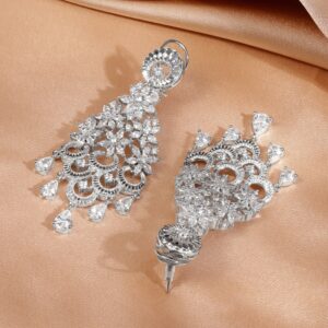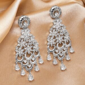 rhodium-plated chandelier earrings in silver tone featuring cascading floral motifs and white cubic zirconia stones. A dazzling pick for women for weddings and special occasions. Occasion : Bring your style to a whole new level with this handcrafted piece of jewellery. When you’re celebrating a special Occasion : – a birthday, wedding, parties, festive or personal milestone – this piece adds that extra something that makes us feel special and looking our best. Material & Care Dimension Length : 8.2 cm ; Width : 3 cm Net Weight : 42 Gram Material : Brass Net Quantity : 1 Pair of Earrings Care Label : It is advisable to avoid contact with water and organic chemicals i.e. perfume sprays. Store jewellery in airtight box. After use, wipe the jewellery with soft cotton cloth.