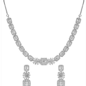 This rhodium-plated necklace set features alternating floral and geometric motifs, fully studded with white cubic zirconia stones – a radiant piece for modern occasions and refined evening styling. Occasion : Bring your style to a whole new level with this handcrafted piece of jewellery. When you’re celebrating a special Occasion : – a birthday, wedding, festive or personal milestone – this piece adds that extra something that makes us feel special and looking our best. Material & Care Dimension : Necklace – 43 cm ,Earrings – 3.7 cm Material: Brass Net Weight: 60 Gram Net Quantity: 1 Necklace & 1 Pair of Earrings Care Label: It is advisable to avoid contact with water and organic chemicals i.e. perfume sprays. Store jewellery in airtight box. After use, wipe the jewellery with soft cotton cloth.
