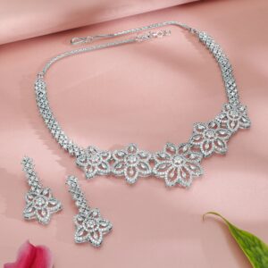 Elegant rhodium-plated floral set with white cubic zirconia for a refined sparkle. This premium set is designed to elevate your style, perfect for sophisticated celebrations and events. Material : & Care Dimension :Length : NS- 16 ; E- 5 cm Width: NS- 12 ; E- 2.5 W Material :Brass Care Label : It is advisable to avoid contact with water and organic chemicals i.e. perfume sprays. Store jewellery in airtight box. After use, wipe the jewellery with soft cotton cloth.