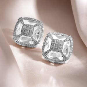Earrings : These elegant rhodium-plated stud earrings feature a geometric design, with sparkling white cubic zirconia stones, perfect for adding a modern touch of glamour to any outfit. Occasion : Bring your style to a whole new level with this handcrafted piece of jewellery. When you’re celebrating a special Occasion : – a birthday, wedding, or personal milestone – this piece adds that extra something that makes us feel special and looking our best. Material : & Care Dimension : Length : 2CM, Width: 2CM Material: Alloy Net Weight: 8 Gram Net Quantity: 1 Pair of Earrings Care Label: It is advisable to avoid contact with water and organic chemicals i.e. perfume sprays. Store jewellery in airtight box. After use, wipe the jewellery with soft cotton cloth.