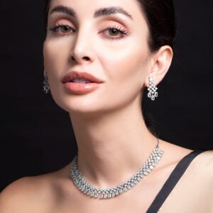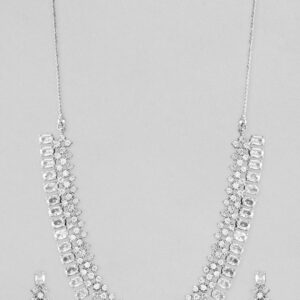 it’s a jewellery set fit for the queens! Exude the royal vibe with this cubic zirconia stone studded jewellery set. Consisting of a necklace, matching earrings, this necklace set is crafted from rhodium-plated brass, stones and beads. Occasion : Bring your style to a whole new level with this handcrafted piece of jewellery. When you’re celebrating a special Occasion : – a birthday, wedding, festive or personal milestone – this piece adds that extra something that makes us feel special and looking our best. Material & Care Dimension :Necklace: 35 cm; Earrings: 2.8 cm Collection : Cubic Zirconia Material: Brass Net Weight: 40 Gram Net Quantity: 1 Necklace & 1 Pair of Earrings Care Label: It is advisable to avoid contact with water and organic chemicals i.e. perfume sprays. Store jewellery in airtight box. After use, wipe the jewellery with soft cotton cloth.