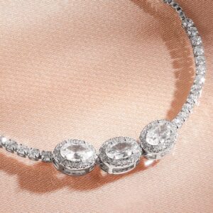 Bracelet : This rhodium-plated adjustable pull chain bracelet features sparkling white cubic zirconia stones, including three dazzling oval-cut centerpieces. The sliding chain closure ensures a secure and customizable fit, making it both luxurious and comfortable. ( Occasion : Bring your style to a whole new level with this handcrafted piece of jewellery. When you’re celebrating a special Occasion : – a birthday, wedding, or personal milestone – this piece adds that extra something that makes us feel special and looking our best. Material : & Care Dimension : Length : 12 cm, Width: 0.5 cm Net Weight: 6.12 g Net Quantity : 1 Bracelet Material :Brass Care Label : It is advisable to avoid contact with water and organic chemicals i.e. perfume sprays. Store jewellery in airtight box. After use, wipe the jewellery with soft cotton cloth.