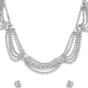 Enhance your elegance with this rhodium-plated necklace set adorned with white zirconia stones in a layered design. The set includes a necklace and matching earrings, both featuring stunning white zirconia stones that radiate a brilliant sparkle. The rhodium plating adds a sleek and polished silver-tone finish, exuding a modern and sophisticated charm. The layered necklace design adds depth and visual interest, creating a captivating and luxurious look. The matching earrings complete the set, perfectly complementing the necklace with their dazzling elegance. Material : & Care Dimension : Necklace Length: 60 cm Earrings Length: 0.6 cm Material : Brass Care Label : It is advisable to avoid contact with water and organic chemicals i.e. perfume sprays. Store jewellery in airtight box. After use, wipe the jewellery with soft cotton cloth.