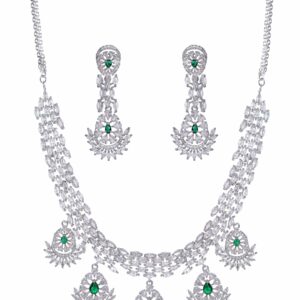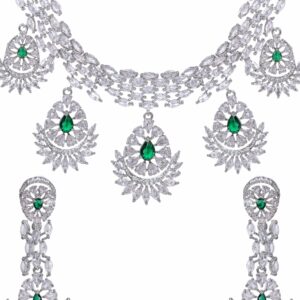 The Rhodium plated Zirconia studded Statement Drop Detail Choker Necklace Set is a chic and sophisticated ensemble. With its rhodium plating, it boasts a polished finish that complements any attire. The choker necklace features statement drop details adorned with shimmering zirconia stones, creating an elegant and captivating piece. This set is perfect for special occasions, exuding timeless beauty and charm. Its an ideal choice for those who appreciate making a statement with a choker necklace set featuring exquisite drop accents. Material & Care Dimension : Necklace : 20 cm Earrings : 5.5 cm Material: Brass Net Weight: 60 Gram Net Quantity: 1 Necklace & 1 Pair of Earrings Care Label: It is advisable to avoid contact with water and organic chemicals i.e. perfume sprays. Store jewellery in airtight box. After use, wipe the jewellery with soft cotton cloth.
