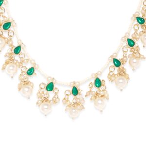 The green stones exude a sense of nature’s splendor, gracefully interspersed with luminous white pearls that add a touch of elegance. Each stone and pearl is carefully handcrafted to perfection, resulting in a necklace that is a true work of art. Material & Care Dimension : 32 cm Material : Brass Weight : 25.8g Net Qnty : 1 Necklace Care Label : It is advisable to avoid contact with water and organic chemicals i.e. perfume sprays. Store jewellery in airtight box. After use, wipe the jewellery with soft cotton cloth.