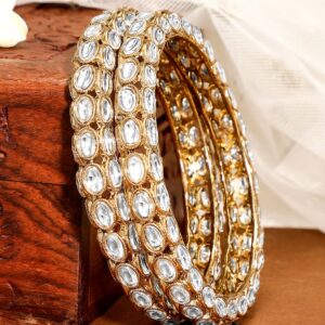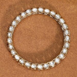 Bangle : Elevate your traditional look with this set of 2 18K gold-plated bangles featuring lustrous Kundan stones. Designed with intricate detailing, these bangles add timeless elegance to any ethnic outfit. Occasion : Bring your style to a whole new level with this handcrafted piece of jewellery. When you’re celebrating a special Occasion : – a birthday, wedding, or personal milestone – this piece adds that extra something that makes us feel special and looking our best. Material : & Care Dimension : Net Weight: 56.41 g Net Quantity: 2 Bangles Material :Brass Care Label : It is advisable to avoid contact with water and organic chemicals i.e. perfume sprays. Store jewellery in airtight box. After use, wipe the jewellery with soft cotton cloth.