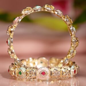 Adorn your wrists with these 18K gold-plated bangles, exquisitely designed with multicolor enamel detailing and ruby red & emerald green stone embellishments. The intricate floral and embossed motifs create a regal look, making them ideal for weddings, festive occasions, and grand celebrations. Occasion : Bring your style to a whole new level with this handcrafted piece of jewellery. When you’re celebrating a special Occasion : – a birthday, wedding, or personal milestone – this piece adds that extra something that makes us feel special and looking our best. Material : & Care Net Weight: 150 g Net Quantity : 2 Bangles Material :Brass Care Label : It is advisable to avoid contact with water and organic chemicals i.e. perfume sprays. Store jewellery in airtight box. After use, wipe the jewellery with soft cotton cloth.