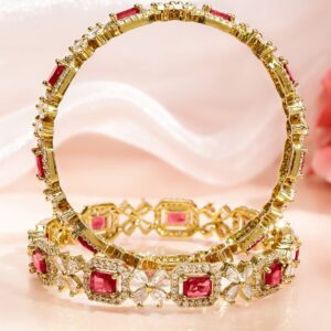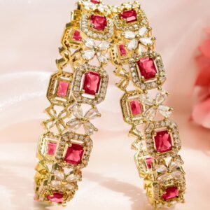Bangle : Crafted in 18K gold-plating, these bangles feature ruby red square stones and floral white zirconia detailing, radiating festive charm and regal elegance for bridal and traditional attire. Perfect for Bridal & Festive Wear: Ideal for brides, bridesmaids, or festive dressing, these bangles elevate ethnic wear like sarees and lehengas with their bold and traditional flair. Material & Care Material: Brass Plating : Gold Plated Net Weight: 47 Gram Net Quantity: 2 Bangles Care Label : It is advisable to avoid contact with water and organic chemicals i.e. perfume sprays. Store jewellery in airtight box. After use, wipe the jewellery with soft cotton cloth.