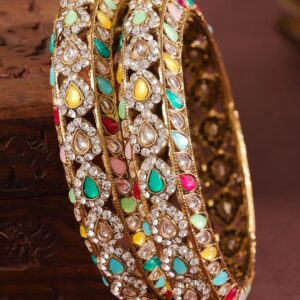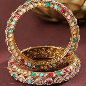 Bangles : Set of 2 designer bangles crafted in 18K mehandi gold-plating, featuring multicolor kundan stones and cubic zirconia detailing. Perfect for bridal wear, festive celebrations, and traditional ensembles. Festive & Bridal Styling: Perfect for bridal looks, traditional outfits, or festive events—these bangles pair beautifully with sarees, lehengas, and anarkalis for an opulent finishing touch. Material : & Care Material :Brass Weight : 68.61 Gram Net Qnty : 2 Bangles Care Label : It is advisable to avoid contact with water and organic chemicals i.e. perfume sprays. Store jewellery in airtight box. After use, wipe the jewellery with soft cotton cloth.