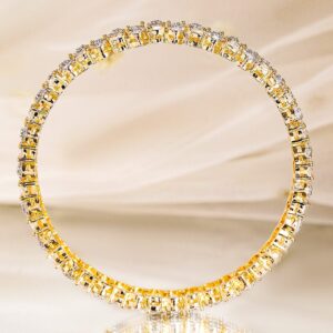 Set of 2 premium 22K gold-plated bangles, meticulously crafted with shimmering cubic zirconia in a radiant double-row design, exuding timeless elegance. Material: Brass Plating : Gold Plated Net Weight: 46.56 Gram Net Quantity: 2 Bangles Care Label: It is advisable to avoid contact with water and organic chemicals i.e. perfume sprays. Store jewellery in airtight box. After use, wipe the jewellery with soft cotton cloth.