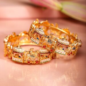 Bangles & Bracelet : These 22K gold-plated handcrafted bridal bangles showcase an ornate procession motif with intricate multicolor enamel work, red and green stone accents, and miniature detailing, making them a perfect heritage piece for weddings and festive occasions. Occasion : Bring your style to a whole new level with this handcrafted piece of jewellery. When you’re celebrating a special Occasion : – a birthday, wedding, or personal milestone – this piece adds that extra something that makes us feel special and looking our best. Material : & Care Net Quantity : 2 Bangles Net Weight: 92.18 g Material :Brass Care Label : It is advisable to avoid contact with water and organic chemicals i.e. perfume sprays. Store jewellery in airtight box. After use, wipe the jewellery with soft cotton cloth.