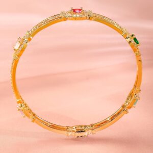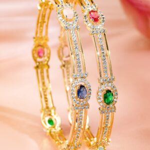 Bangle : This exquisite piece, ‘ Set Of 2 22K Gold-Plated Multicolor Gemstone & Cubic Zirconia-Studded Bangles’, is a perfect blend of elegance and craftsmanship. Designed to captivate, it reflects timeless beauty and intricate detailing. Ideal for special occasions, this accessory adds a touch of sophistication to your look. Made with high-quality materials, it guarantees durability and comfort. Elevate your style with this stunning creation, making you stand out effortlessly. Occasion : Bring your style to a whole new level with this handcrafted piece of jewellery. When you’re celebrating a special Occasion : – a birthday, wedding, or personal milestone – this piece adds that extra something that makes us feel special and looking our best. Material : & Care Material: Brass Net Weight: 25 Gram Net Quantity: 2 Bangles Care Label : It is advisable to avoid contact with water and organic chemicals i.e. perfume sprays. Store jewellery in airtight box. After use, wipe the jewellery with soft cotton cloth.