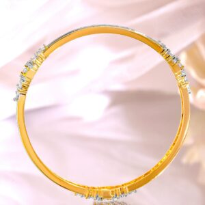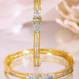 Bangle : A sophisticated set of 2 bangles with 22K gold plating, rhodium accents, and cubic zirconia stones. A perfect addition for blending traditional charm with modern elegance. Occasion : Bring your style to a whole new level with this handcrafted piece of jewellery. When you’re celebrating a special Occasion : – a birthday, wedding, or personal milestone – this piece adds that extra something that makes us feel special and looking our best. Material : & Care Dimension : Net Weight: 28.17g Net Quantity: 2 Bangles Material :Brass Care Label : It is advisable to avoid contact with water and organic chemicals i.e. perfume sprays. Store jewellery in airtight box. After use, wipe the jewellery with soft cotton cloth.