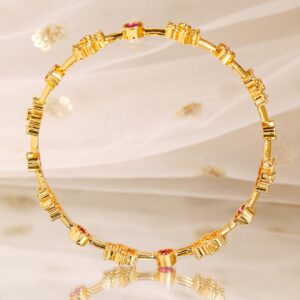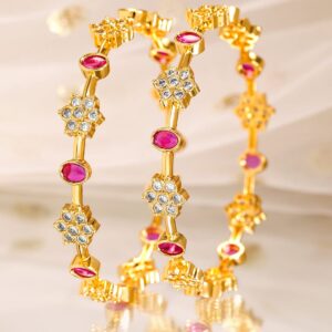 A set of 2 elegant 22K gold-plated handcrafted bangles adorned with ruby pink stones and sparkling cubic zirconia. These delicate floral-patterned bangles add a touch of sophistication and charm to any outfit. Material: Brass Net Weight: 29.75 Gram Net Quantity: 2 Bangles Care Label: It is advisable to avoid contact with water and organic chemicals i.e. perfume sprays. Store jewellery in airtight box. After use, wipe the jewellery with soft cotton cloth.