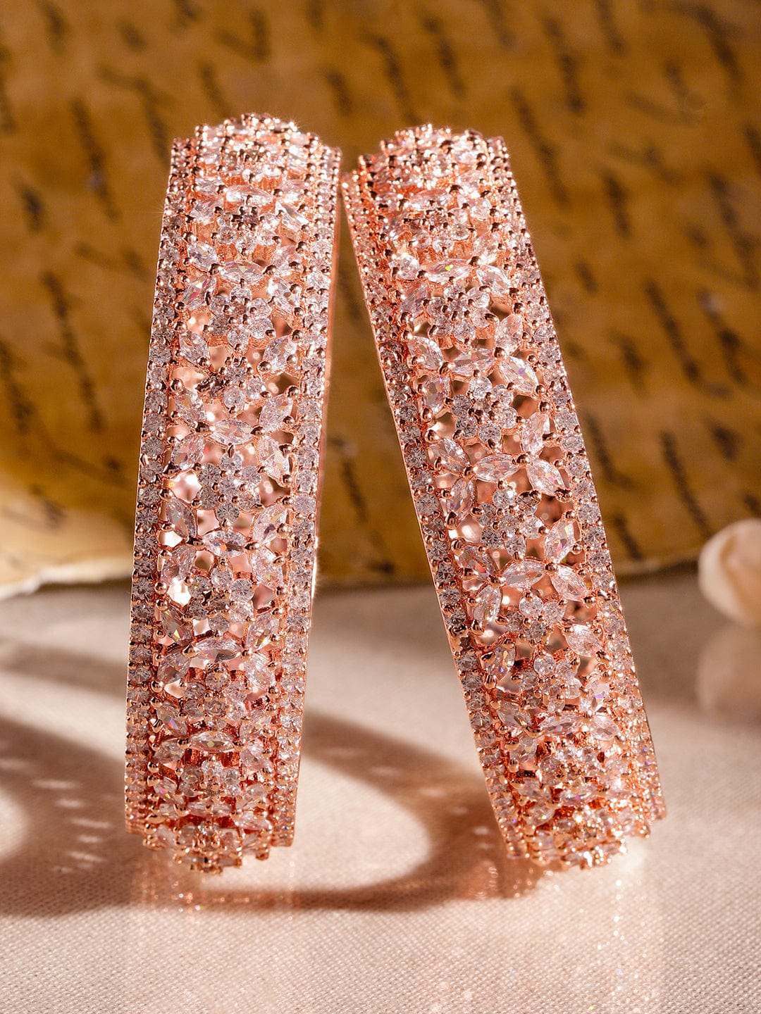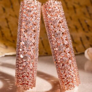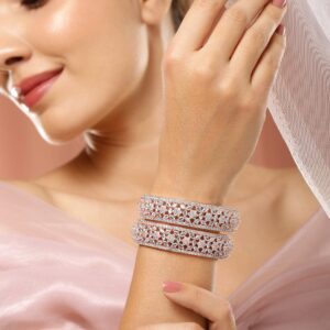 These 22K rose gold plated bangles come in a set of 2, featuring a floral cutwork design adorned with sparkling cubic zirconia stones, perfect to add elegance to wedding, festive and special occasion looks. Occasion : Bring your style to a whole new level with this handcrafted piece of jewellery. When you’re celebrating a special Occasion : – a birthday, wedding, festive or personal milestone – this piece adds that extra something that makes us feel special and looking our best. Material & Care Material: Brass Plating : Rose Gold Plated Net Weight: 71.69 Gram Net Quantity: 2 Bangles Care Label: It is advisable to avoid contact with water and organic chemicals i.e. perfume sprays. Store jewellery in airtight box. After use, wipe the jewellery with soft cotton cloth.