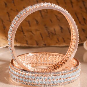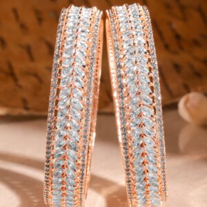 This set of 2 handcrafted bangles features an elegant 22K rose gold-plated finish, adorned with marquise-cut white cubic zirconia in a delicate leaf motif design. The intricate detailing enhances its luxurious appeal, making it a perfect statement piece for festive and wedding occasions. Material: Brass Plating : Rose Gold Plated Net Weight: 57.78 Gram Net Quantity: 2 Bangles Care Label: It is advisable to avoid contact with water and organic chemicals i.e. perfume sprays. Store jewellery in airtight box. After use, wipe the jewellery with soft cotton cloth.
