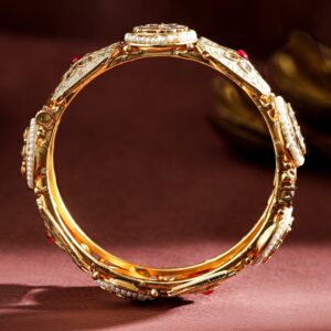 Adorn your wrists with these 24K gold-plated handcrafted bangles, featuring floral Kundan work, pearl embellishments & intricate pastel meenakari detailing, perfect for weddings & festive occasions. Occasion : Bring your style to a whole new level with this handcrafted piece of jewellery. When you’re celebrating a special Occasion : – a birthday, wedding, or personal milestone – this piece adds that extra something that makes us feel special and looking our best. Material : & Care Material: Brass Net Weight: 94.58 g Net Quantity: 2 Bangles Care Label : It is advisable to avoid contact with water and organic chemicals i.e. perfume sprays. Store jewellery in airtight box. After use, wipe the jewellery with soft cotton cloth.