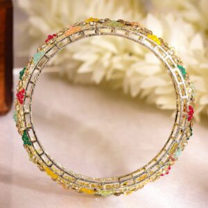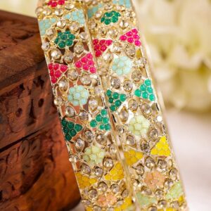 Bangle : This exquisite piece, ‘ Set of 2 Stone Studded 22KT Gold Plated Stone Studded Bangles’, is a perfect blend of elegance and craftsmanship. Designed to captivate, it reflects timeless beauty and intricate detailing. Ideal for special occasions, this accessory adds a touch of sophistication to your look. Made with high-quality materials, it guarantees durability and comfort. Elevate your style with this stunning creation, making you stand out effortlessly. Occasion : Bring your style to a whole new level with this handcrafted piece of jewellery. When you’re celebrating a special Occasion : – a birthday, wedding, or personal milestone – this piece adds that extra something that makes us feel special and looking our best. Material : & Care Material : Brass Weight :45 g Net Qnty : 2 Bangles Care Label : It is advisable to avoid contact with water and organic chemicals i.e. perfume sprays. Store jewellery in airtight box. After use, wipe the jewellery with soft cotton cloth.